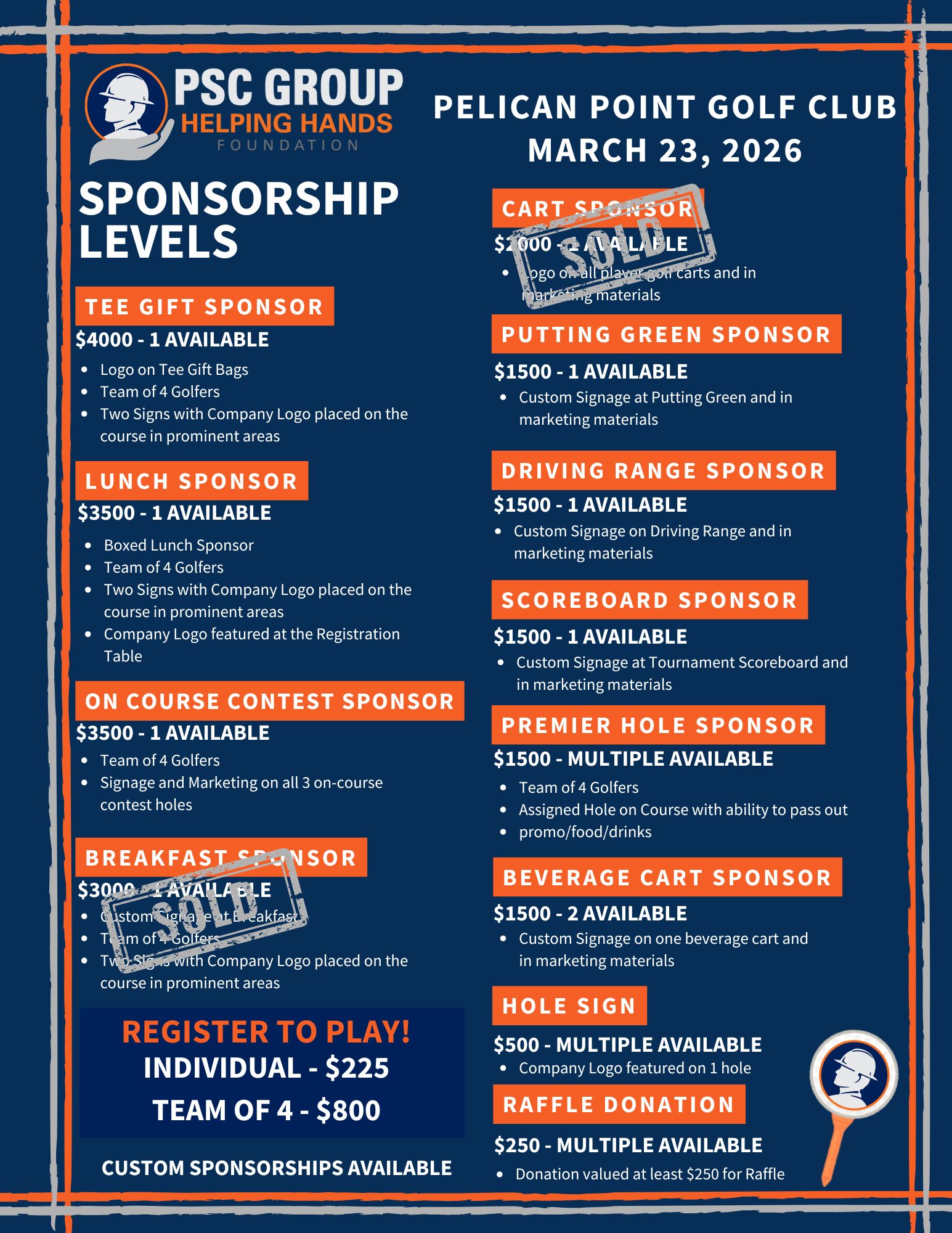 Get ready to tee off for a great cause! The PSC Group Helping Hands Foundation Golf Tournament is happening Monday, March 23rd at Pelican Point Golf Club — and registration is now open! Join us for a day of fun, friendly competition, and community impact as we raise funds to support education, local families, and other vital causes.